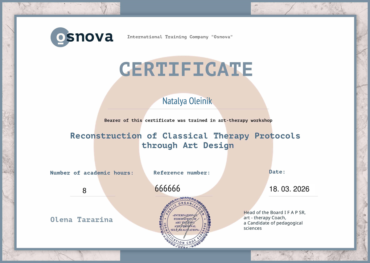 - Сертифікований навчальний арттерапевт.