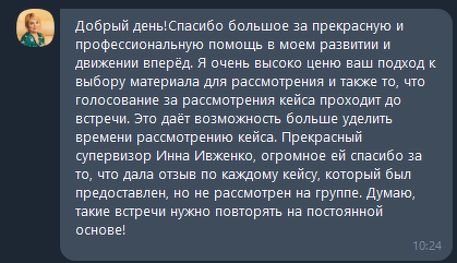 - Обсуждение конкретных кейсов — возможность получить свежий взгляд на вашу работу и поддержку в сложных ситуациях.